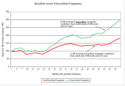 If there is a consolation prize for investors in this graph, it is that the returns you make on your investment in a company are driven by a different dynamic. If stocks are value driven, the stock price for a company will reflect its investment choices, and companies that invest their money badly will be priced lower than companies that invest their money well. The returns you will make on these companies, though, will depend upon whether the excess returns that they deliver in the future are greater or lower than expectations. Thus, a company that earns a return on capital of 5%, much lower than its cost of capital of 10%, which is priced to continue earning the same return will see if its stock price increase, if it can improve its return on capital to 7%, still lower than the cost of capital, but higher than expected. By the same token, a company that earns a return on capital of 25%, well above its cost of capital of 10%, and priced on the assumption that it can continue on its value generating path, will see its stock price drop, if the returns it generates on capital drop to 20%, well above the cost of capital, but still below expectations. That may explain a graph like the following, where researchers found that investing in bad (unexcellent) companies generated far better returns than investing in good (excellent) companies: