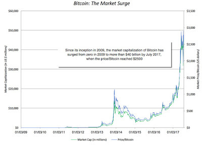 The Market BoomAny discussion of crypto currencies has to start with the recognition that the experiment is still young. Satoshi Nakamoto's paper on bitcoin was made public in October 2008 and implemented as open source in January 2009. Less than ten years later, the market capitalization of bitcoin alone is in excess of $40 billion and the success story, at least in terms of bitcoin as an investment, can be seen in the graph below: