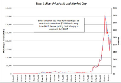 Bitcoin's success, at least in the financial markets, has attracted a host of competitors, with Ethereum (Ether) being the most successful. Ether's rise in market price, since its introduction in 2015 has been even more precipitous that Bitcoin's, though it has pulled back in recent weeks: