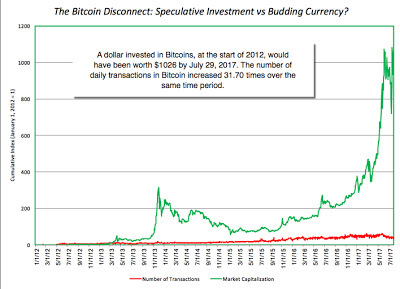 While the price of bitcoin has increase more than a thousand fold, since the start of 2012, the number of transactions involving bitcoin was only about thirty two times larger in July 2017 than what it was at the start of 2012. In my view, there are three possible explanations for the divergence, and they are not mutually exclusive: