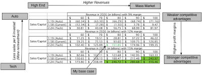 With my base case story of Tesla being an auto/tech company with revenues pushing towards mass market levels and margins resembling those of tech companies, I estimated a value of about $151 a share for the company and my best case estimate of value was $316.46.