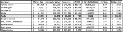 Largest Auto Companies (Market Capitalization) on August 9, 2017While Tesla's market cap has caught up with larger and more established auto makers, its production and revenues are a fraction of theirs, leading some to use metrics like enterprise value per car sold to conclude that Tesla is massively over valued. I don't have much faith in these pricing metrics to begin with, but even less so when comparing a company with massive potential to companies that are in decline, as I think many of the conventional auto companies in this table are currently.