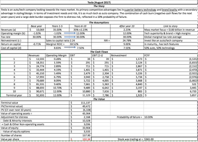 Download spreadsheetAs with every Tesla valuation that I have done, I am sure (and I hope) that you will disagree with me, with some finding me way too pessimistic about Tesla's future, and others, much too optimistic. As always, rather than tell me what you think I am getting wrong, I would encourage you to download the spreadsheet and replace my assumption with yours. I think I am being clear eyed about the challenges that Tesla will face along the way and here are the top three: Can Tesla sell millions of cars? One of Tesla's accomplishments has been exposing the potential of the hybrid/electric car market, even in an era of restrained fuel prices. That is good news for Tesla, but it has also woken up the established automobile companies, as is evidenced by not only the news from Volvo and Ford, but also in increased activity on this front at the other automobile companies. In my valuation, the revenues that I project in 2027 will require Tesla to sell close to 2 million cars, in the face of increased competition.Can it make millions of cars? Tesla's current production capacity is constrained and there are two production tests that Tesla has to meet. The first is timing, since the Tesla 3 deliveries have been promised for the middle of 2018, and the assembly lines have to be humming by then. The second is cost, since a subtext of the Tesla story, reinforced by hints from Elon Musk, is that the company has found new and innovative ways of scaling up production quickly and at much lower costs than conventional automobile companies. Can it generate double digit margins? In my valuation, I assume an operating margin of 12% for Tesla, almost double the average of 6.33% for global auto companies. For Tesla to generate this higher margin, it has to be able to keep production costs low at its existing and new assembly plants and to be able to charge a premium price for its automobiles, perhaps because of its brand name. Tesla has shown a capacity to attract and keep customers and I think it is more than capable of meeting the first challenge, i.e., sell millions of cars, especially since its competition is saddled with legacy costs and image problems. It is the production challenge that is the more daunting one, simply because this has always been Tesla's weakest link. Over the last few years, Tesla has consistently had trouble meeting logistical and delivery targets it has set for itself, and those targets will only get more daunting in the years to come. Furthermore, if its production costs run above expectations, it will be unable to deliver on higher margins. To succeed, Tesla will require vision, focus and operating discipline. With Elon Musk at its helm, the company will never lack vision, but as I argued in my July 2016 post, Mr. Musk may need a chief operating officer at his side to take care of delivery deadlines and supply chains.
