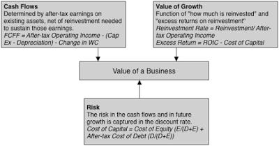 To understand how the tax code affects the value of a business, let's go back to basics, and link the value of a business to three component parts: the cash flows generated from existing assets, the value of future growth and a risk adjustment, usually taking the form of a cost of capital or discount rate.