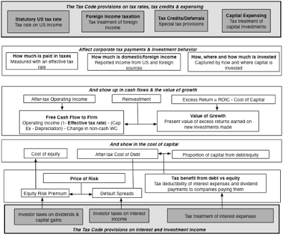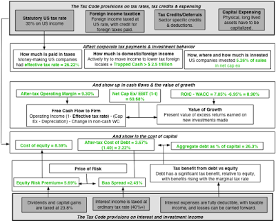 Where does the tax rate show up in value? Everywhere, since each of these drivers is affected by not just the tax rate, but also by other provisions in the tax code. Cash flows from existing investments: The cash flow from existing investments is estimated by starting with after-tax operating income and then subtracting out the reinvestment needed to sustain future growth. Since the cash flow is an after-tax cash flow, the effective tax rate paid by a firm will affect that cash flow, with higher effective tax rates resulting in lower after-tax cash flows. The statutory tax rate in the tax code is a driver, albeit not the only one, of the effective tax rate, but so are the provisions of the code that relate to the taxation of foreign income, as well as tax credits and special tax deductions that are directed at specific sectors. Cost of capital (or discount rate): The cost of capital is a weighted average of the cost of equity and after-tax cost of debt, with the weights reflecting how much of each is used to fund operations. The most direct effect of the tax code arises from its tilt being towards debt, in much of the world. In particular, the tax benefit of debt takes the form of tax deductible interest expenses and the benefits of borrowing will increase with the statutory tax rate (or the marginal tax rate). There are more subtle effects, as well, that come from how the tax code treats investment income in the hands of investors, since changing tax rates on dividends and capital gains can affect the price charged by investors for taking equity risk (i.e., the equity risk premium) and altering the tax rates on interest income earned by investors can affect the price charged by investors in the bond market (i.e., default spreads).Value of growth: The value of growth can be traced back to the amount that companies reinvest back into themselves (measured as a reinvestment rate) and the excess returns generated on those investments (captured as an excess return, or the difference between return on invested capital and the cost of capital). The tax code can affect both the reinvestment rate and excess returns, with provisions either encouraging or discouraging more investment and the after-tax earnings showing up in the return on capital and excess returns. It is on this dimension that the effects of changes in the tax code become most unpredictable, since they affect both returns and costs of capital. Lwering the statutory tax rate can increase after-tax cash flows and returns but also increase the cost of capital, by reducing the tax benefits from debt.The figure below captures the full picture of how taxes affect almost every input into value, and thus value.