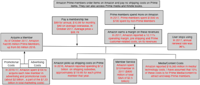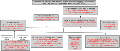 The Economics of Amazon PrimeTo understand how Amazon Prime works, let’s break down the mechanics. Any one (in the countries where Prime is offered) can become a Prime member, either on a monthly or an annual basis. In the US, in 2017, the annual fee for membership was $99, as it has been for the last few years, and the monthly fee was $10.99. With 85 million members, that translates into a total revenue for the company of over $8.5 billion; the monthly members pay more but there is a portion of the membership (including students) who get discounted memberships. The other benefit for Amazon, though, comes from the fact that Amazon Prime members spend more on Amazon than non-Prime members. While the exact numbers are known only to Amazon, the most recently leaked reports suggest that the typical Prime member spends approximately $1,300/year on Amazon products, as opposed to the $700 spent by a non-Prime member. While it seems obvious, then, that Prime membership leads to more spending ($600, if you believe these two numbers), the statisticians will raise red flags about sampling bias since the true incremental revenue is unobservable; it is the difference between what the existing Prime members are spending ($1300/year) and what those same members would have spent, if they did not have Prime memberships. That is a reasonable point, but there is clearly a Prime impact, where Prime members choose Prime items over less expensive non-Prime offerings on Amazon, just as I do.