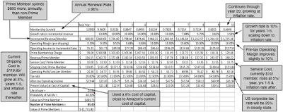 The biggest cost, by far, to Amazon is the shipping cost that the company now bears on Prime items. In 2016, the company reported net shipping subsidy costs of $7.2 billion (in the footnotes to the 10K) and assuming that almost all of these costs were related to servicing the 60 million members that Amazon had in 2016 leads to a per-member shipping cost of close to $120/ member. The other free services that Amazon offers its Prime members also create costs, though those costs are embedded in larger company-wide items and are more difficult to separate out. The company expends administrative costs in providing additional customer service to its Prime members. These costs are part of the total G&A cost of $2,432 million that the company reported in 2016, but we will assume that the servicing cost per member was $10 (or $600 million in the aggregate in 2016).The company also buys some content for its media and Kindle reading sections specifically to back up its Prime membership. Again, that cost is part of the $16,085 million that the company as its technology and content cost in 2016 and we will assume that 10% of those costs (approximately $1.6 billion) can be attributed to Amazon Prime.There is one final component of cost that we would like to know, but have to guess at and that is the cost to Amazon of acquiring a new member. That promotional/marketing cost is part of the total marketing cost of $7,233 million that Amazon reported in 2016 and we will assume that this cost is $100/member; in 2016, this would have translated into a total cost of $2 billion to acquire 20 million new members, leaving the remaining $5.2 billion in marketing costs as conventional advertising/marketing cost. Pulling all these numbers, real and imagined, into a picture, here is what we get as the economics of an Amazon Prime member.