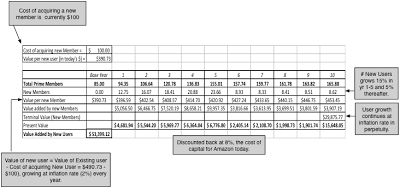 The Value of a New MemberTo get from the value of an existing member to that of a new member, you need to have a measure of how much Amazon is spending to acquire new members. As I noted earlier, the company is opaque on this issue, though I would hazard a guess that it is a much more onerous number outside the United States. If you work with my guess of $100/new member as the base year number, we need only one more estimate to get to the value of new members and that is the growth in the membership base. Given the success that the company has shown on this front in the last five years, we will assume a growth rate of 15% for the next five years (which will bring Prime membership to 155 million in 2022). Given that large base, we will scale growth down to 5% a year from years 6-10 and to 1.5% a year thereafter.