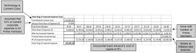 The Corporate DragWhile it is tempting to stop and add the value of existing members and new members to arrive at the value of Amazon Prime, you would be missing a significant cost that we will term the corporate drag. To feed its ambitions with Prime, Amazon is spending far more on media content (books, movies, TV shows) than it would otherwise have and those costs will continue to grow with Prime. Earlier, we assume that 10% of the company’s current technology/media costs are attributable to Prime, yielding a base year cost of $1,609 million. We will assume that these costs will grow with the number of Prime members, yielding the following value for future costs: