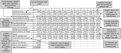 Using the numbers from the previous section as a starting point, we are on our way to valuing an existing Prime member. To get to that value, we have to make some estimates for the future that reflect how the base numbers will evolve over time:Renewal Rate: We will assume that annual renewal rates will stay high, at 96%, since the subscription model and the dependence on free shipping makes dropping the service difficult to do. Incremental Revenue/ Member Growth: As Amazon looks for new products and services to sell its Prime members, we will assume that the company’s legendary marketing skills will work and that the incremental revenue (which we estimated to be $600 and attributed entirely to Prime membership) will grow 10% a year for the next five years. That growth rate will scale down to the inflation rate (1.50%) in year 10, but that cumulated effect will result in incremental sales of $1,275/member in 2027. Operating Margins on revenues: To estimate the operating margin on revenues, I started with Amazon's operating margin but then added back the shipping, customer service and Prime media acquisition costs, since I treat them as separate costs. The resulting margin is 12.11%.Shipping Costs: The biggest cost to Amazon is shipping and much of what the company seems to be doing both in terms of new investments (in distribution centers, trucks and drop off locations) and acquisitions (Whole Foods) seems to be designed to keep these costs in check. We will assume that shipping costs will grow 3% a year for the next five years (well below the incremental revenue growth), before settling into growing at the inflation rate thereafter. Customer Service Costs: The cost of Prime member customer service will increase 5% a year for the next 5 years and the inflation rate thereafter.Risk and Cost of Capital: I will assume that Amazon’s overall cost of capital applies as the right risk adjusted rate to use on all of its member valuations, since they partake in its entire product line. That cost of capital, in October 2017, given a US treasury bond rate of 2.35% was 8.00%.With those assumptions in place, we can estimate the value of a Prime member: