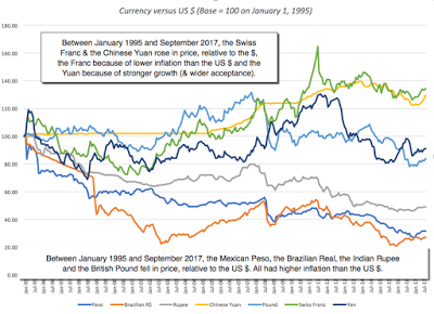 Cash Generating Asset: An asset generates or is expected to generate cash flows in the future. A business that you own is definitely an asset, as is a claim on the cash flows on that business. Those claims can be either contractually set (bonds or debt), residual (equity or stock) or even contingent (options). What assets share in common is that these cash flows can be valued, and assets with high cash flows and less risk should be valued more than assets with lower cash flows and more risk. At the same time, assets can also be priced, relative to each other, by scaling the price that you pay to a common metric. With stocks, this takes the form of comparing pricing multiples (PE ratio, EV/EBITDA, Price to Book or Value/Sales) across similar companies to form pricing judgments of which stocks are cheap and which ones are expensive.Commodity: A commodity derives its value from its use as raw material to meet a fundamental need, whether it be energy, food or shelter. While that value can be estimated by looking at the demand for and supply of the commodity, there are long lag and lead times in both that make that valuation process much more difficult than for an asset. Consequently, commodities tend to be priced, often relative to their own history, with normalized oil, coal wheat or iron ore prices being computed by averaging prices across long cycles.Currency: A currency is a medium of exchange that you use to denominate cash flows and is a store of purchasing power, if you choose to not invest. Standing alone, currencies have no cash flows and cannot be valued, but they can be priced against other currencies. In the long term, currencies that are accepted more widely as a medium of exchange and that hold their purchasing power better over time should see their prices rise, relative to currencies that don't have those characteristics. In the short term, though, other forces including governments trying to manipulate exchange rates can dominate. Using a more conventional currency example, you can see this in a graph of the US $ against seven fiat currencies, where over the long term (1995-2017), you can see the Swiss Franc and the Chinese Yuan increasing in price, relative to the $, and the Mexican Peso, Brazilian Real, Indian Rupee and British Pound, dropping in price, again relative to the $.