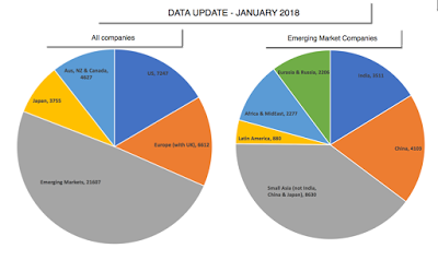 Download spreadsheetSince the emerging market grouping includes firms from Asia, Latin America, Africa and Eurasia, I also have the data for sub-groups including India, China, Small Asia (other than India, China and Japan), Latin America, Africa & MidEast and Russia/Eurasia. That is pictured in the second pie chart above.