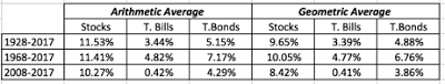 Putting 2017 in perspective, adding the 2017 returns for stocks, T.Bonds and T.Bills to the historical data yields the following historical annual average returns for the three asset classes: