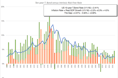 To evaluate whether the T.Bond rate is at a level that can be justified by fundamentals, I fall back on an approach that I have used before, where I compare the T.Bond rate to an intrinsic risk free rate that I compute by adding the inflation rate for the year to real growth rate in the economy (GDP real growth rate). While those numbers are still not final for 2017, using the most recent values for both allows for an update of my intrinsic interest rate chart:
