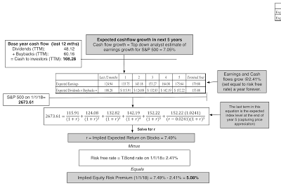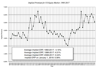 Looking ForwardWhile it is tempting to continue to dissect last year's numbers, it is healthier to turn our attention to the future. It is why I have increasingly moved away from using historical risk premiums, like the 4.77% premium that I computed by looking at the 1928-2017 return table, and towards implied equity risk premiums, where I back out what investors are demanding as a premium for investing in stocks by looking at how much they pay for stocks and what they expect to generate as cash flows. (Think of it as an IRR for stocks, analogous to the yield to maturity on a bond). At the start of 2018, putting this approach into play, I estimated an equity risk premium of 5.08% for the S&P 500: