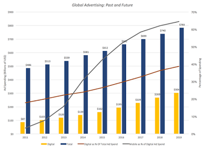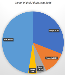 The Online Advertising BusinessIf you classify Snap as an online advertising company, the next step in the process becomes simple: identifying the total market for online advertising, the players in that market and what place you would give Snap in this market. Let’s start with some basic data on the online advertising market.It is a big market, growing and tilting to mobile: The digital online advertising market is growing, mostly at the expense of conventional advertising (newspapers, TV, billboards) etc. You can see this in the graph below, where I plot total advertising expenditures each year and the portion that is online advertising for 2011-2016 and with forecasted values for 2017-2019. In 2016, the digital ad market generated revenues globally of close to $200 billion, up from about $100 billion in 2012, and these revenues are expected to climb to over $300 billion in 2020. As a percent of total ad spending of $660 billion in 2016, digital advertising accounted for about 30% and is expected to account for almost 40% in 2020. The mobile portion of digital advertising is also increasing, claiming from about 3.45% of digital ad spending to about half of all ad spending in 2016, with the expectation that it will account for almost two thirds of all digital advertising in 2020.