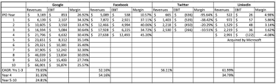GoogleLinkedInFacebookTwitterSnapIPO date19-Aug-0419-May-1118-May-127-Nov-13NARevenues$1,466 $161 $3,711 $449 $405 Operating Income$326 $13 $1,756 $(93)$(521)Net Income$143 $2 $668 $(99)$(515)Number of UsersNA80.6845218161User minutes per day (January 2017)50 (Includes YouTube)NA50225Market Capitalization on offering date$23,000 $9,000 $81,000 $18,000 ?Link to Prospectus (from IPO date)Link Link Link Link Link