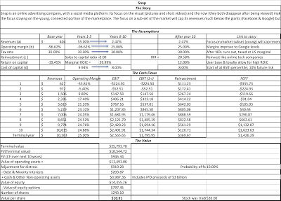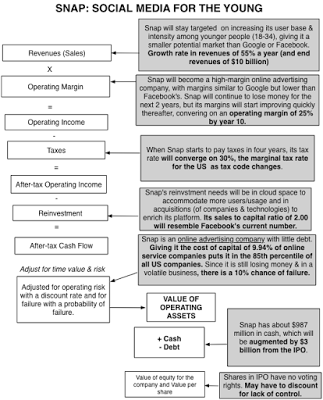 As I finish this post, I notice this news story from this morning that suggests that bankers have arrived at an offering price, yielding a pricing for the company of $18.5 billion to $21.5 billion for the company, about $4 billion above my estimate. So, how do I explain the difference between my valuation and this pricing? First, I have never felt the urge to explain what other people pay for a stock, since it is a free market and investors make their own judgments. Second, and this is keeping with a theme that I have promoted repeatedly in my posts, bankers don't value companies; they price them! If you are missing the contrast between value and price, you are welcome to read this piece that I have on the topic, but simply put, your job in pricing is not to assess the fair value of a company but to decide what investors will pay for the company today. The former is determined by cash flows, growth and risk, i.e., the inputs that I have grappled with in my story and valuation, and the latter is set by what investors are paying for other companies in the space. After all, if investors are willing to attach a pricing of $12 billion to Twitter, a social media company seeming incapable of translating potential to profits, and Microsoft is paying $26 billion for LinkedIn, another social media company whose grasp exceeded its reach, why should they not pay $20 billion for Snap, a company with vastly greater user engagement than either LinkedIn or Twitter? With pricing, everything is relative and Snap may be a bargain at $20 billion to a trader.
