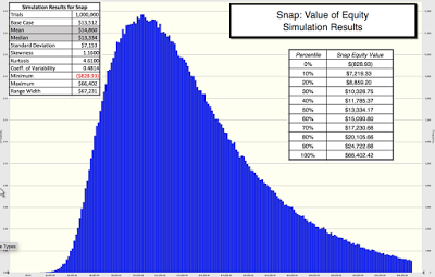 Snap Simulation DetailsAssuming that my share count is right, my value per share is about $11 per share. As you can see though, as is the case with almost any young company where the narrative can take you in other directions, there is a wide range around my expectations, with the lowest value being less than zero and the highest value pushing above $66 billion ($50/share). The median value is $13.3 billion and the average is $14.9 billion; one attractive feature to investors is that there is potential for breakout values (optionality) that exceed $30 billion.