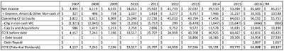 The Cash Machine Revs upIn my last post on dividend payout and cash return globally, I noted that large cash balances don't happen by accident but are a direct result of companies paying out less than they have available as potential dividends or free cash flows to equity, year after year. Since Apple's cash balance almost reached $250 billion in its most recent quarterly report, by far the largest cash balance ever accumulated by a publicly traded company, I decided that the place to start was by looking at how it got to its current level. I started by collecting the operating, debt financing and reinvestment cash flows each year from 2007 to 2016 and computing a free cash flow to equity (or potential dividend) each year.