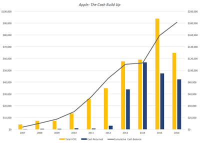 Note that while Apple was returning $183 billion in cash between 2013-2016, its cash balance continued to increase, as its cash inflows increased even more. If having a cash spigot that never turns off is a problem, Apple has it, but I am sure that it will not get about as much sympathy from the rest of the world as a supermodel who complains that she cannot put on weight, no matter how much she eats. The other equally surprising feature of this story is that Apple's managers have not felt the urge (yet) to use their huge cash reserves to buy a company, a whole set of companies or even an entire country, a fact that those who like Apple will attribute to the discipline of its management and Apple haters will argue is due to a lack of imagination.