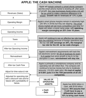 Some of you may find my story too cramped , seeing a greater possibility than I do of Apple breaking through into a new, big market (with Apple Pay or the Apple iCar). If you are in that group, please take my structure and make it yours, with a higher growth rate coming from your disruptive story, accompanied by lower margins and higher reinvestment. Others may find this story too optimistic, perhaps seeing a more precipitous fall of profit margins in the smart phone business and a greater tax liability from trapped cash. You too can alter the inputs to your liking and make your own judgment on Apple!