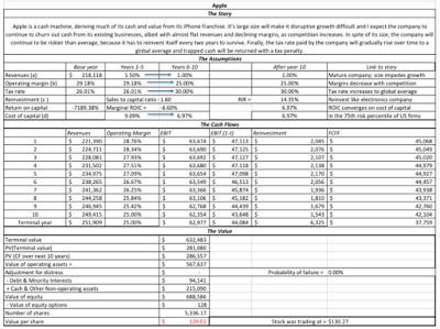 So, in my story, I saw Apple continuing to produce cash flows, with low revenue growth and gradually decreasing margins, as the smartphone business became more competitive. I won't make you read all of the posts that I have on Apple, but let me start with a post that I had in August 2015, when I updated the Apple story (and looked at Facebook and Twitter at the same time). The value I estimated for Apple in that post was $130, higher than the stock price of $110 at the time, prompting me to buy the stock. I revisited the story after an earnings report from Apple in February 2016 and compared it to Alphabet. At the time, I valued Apple at about $126 per share, well above the $94/share that it was trading at the time. In May 2016, Carl Icahn, a long time bull on Apple sold his shares, and Warren Buffett, a long time avoider of tech companies, bought shares in the company. In a Apple's Earnings Report & My NarrativeLast week, Apple released its latest 10Q and in conjunction with its latest 10K (Apple's fiscal year end is in September). It contained a modicum of good news, insofar as there was growth in revenues as opposed to the decline posted in the prior quarter and still-solid profit margins, but the revenue growth was only 3% and the margins are still lower than they used to be. Using the numbers in the most recent report, I took at look at my Apple story and guess what? It looks just like it did last year, a great cash machine, with very slow-growing revenues and declining margins. Using the process that I describe, perhaps in too much detail in my book on narrative and numbers, I converted my story in inputs to my valuation: