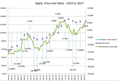Apple's Price/Value DynamicsI have taken my share of punishment on investments that have not gone well, with Valeant being a source of continuing pain (which I will return to after its next earnings report). Apple, though, has served me well in the last decade, but even with Apple, I have had extended periods where my faith has been tested. The picture below graphs Apple's stock price from 2010 and 2017 with my valuations shown across time: