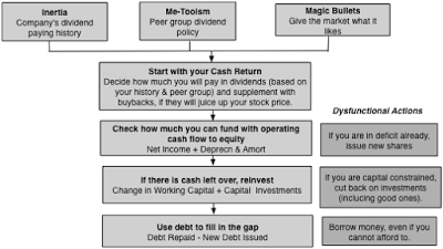 Early in a company’s life, the operating cash flows are often negative (as the company lose money) and the hole gets deeper as the company has to reinvest to generate future growth and is unable to borrow money. Since the potential dividends (FCFE) are big negative numbers, the company will be raising new equity rather than returning cash. As the company starts to grow, the earnings first turn positive but the large reinvestment needs to sustain future growth will continue to keep potential dividends negative, thus justifying a no-cash return policy still. As the company matures, there will be two developments: the operating cash flows to equity will start exceeding reinvestment needs and the company’s capacity to borrow money will open up. While the initial response of the company to these developments will be denial (about no longer being growth companies), you cannot hide from the truth. The cash balance will mount and the company’s capacity to borrow money will be increasingly obvious and pressure will build on it to return some of its cash and borrow money. Even the most resistant firms will eventually capitulate and they will enter the period of plentiful cash returns, with large dividends supplemented by stock buybacks, at least partially funded by debt. Finally, you arrive at that most depressing phase of the corporate life cycle, decline, when reinvestment is replaced with divestitures (shrinking the firm and increasing free cash flows to equity) and the cash return swells. The company, in a sense, is partially liquidating itself over time.The truth is that there are companies where the decision on how much to pay in dividends in not the final one but the one made first. Put differently, rather than making investment and financing decisions first, based upon what works best for the firm, and paying the residual cash flow as dividends, firms make their dividend decisions (and I include buybacks in dividends) first and then modify their financing and investing decisions, given the dividends.