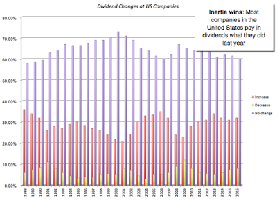 Dividends, Cash Return and Potential Dividends: The US HistoryLet’s start with some history on dividends, using the US market. In the graph below, I start by providing the basis for my inertia theory of dividends by looking at the proportion of US firms each year that increase dividends, decrease dividends and leave dividends unchanged: