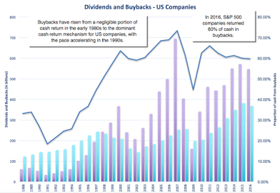 Let’s follow with another fact about US companies. Increasingly, they are replacing dividends, the time-tested way of returning cash to stockholders, with stock buybacks, as you can see in the figure below, where I graph dividends and stock buybacks from the S&P 500 companies from 1988 to 2016.