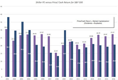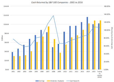 The shift is remarkable. In 1988, almost 70% of all cash returned to stockholders took the form of dividends and by 2016, close to 60% of all cash returned took the form of buybacks. I have written about why this shift has occurred in this post and also why much of the breast beating you hear about how buybacks represent the end of the economy is misdirected. That said, the amount of cash that US companies are returning to stockholders is unsustainable, given the earnings and expectations of growth. In the figure below, I look at for the S&P 500, the cash returned to investors as a proportion of earnings each year from 2001 to 2016:
