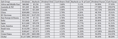 Cash Return: A Global ComparisonHaving looked at US companies, let’s turn the focus to the rest of the world. The stickiness of dividends that we see in the United States is a global phenomenon, though it takes different forms in some parts of the world; in Latin America, for instance, it is payout ratios, not absolute dividends, that companies try to maintain. To provide a measure of cash returned, I report on three statistics: table.tableizer-table { font-size: 12px; border: 1px solid #CCC; font-family: Arial, Helvetica, sans-serif; } .tableizer-table td { padding: 4px; margin: 3px; border: 1px solid #CCC; } .tableizer-table th { background-color: #104E8B; color: #FFF; font-weight: bold; }