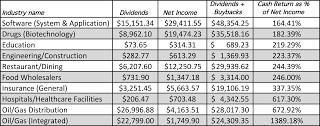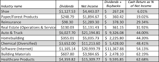 There are wide variations in cash return across sectors, some reflecting where they stand in the life cycle and some just a function of history. In the table below, I highlight the sectors that returned the most cash, as a percent of net income, in the table below:
