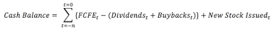 Cash BalancesWhile this post has been about how much cash companies return to stockholders, the inverse of whatever is said about cash return can be said about cash retained in companies, which shows up as cash balances. In fact, if you use potential dividend (FCFE) as your measure of cash that can be returned and dividends plus buybacks as your measure of cash that is actually returned, your cash balance at any point in time for a publicly traded firm can be written as: