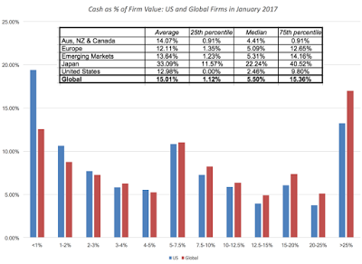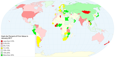 Thus, the median company in the United States at the start of 2017 held 2.45% of its value in cash; remember that with the US tax code’s strictures on foreign income being taxed on repatriation, a significant portion of this cash may be beyond the reach of stockholders, at least for the moment. The median company globally holds 5.50% of value in cash, with small differences across regions with one exception. Japan is the outlier, with the median company holding 22.24% of its value in cash. Expanding the comparison globally, I look at cash as a percent of firm value by country in the picture below: