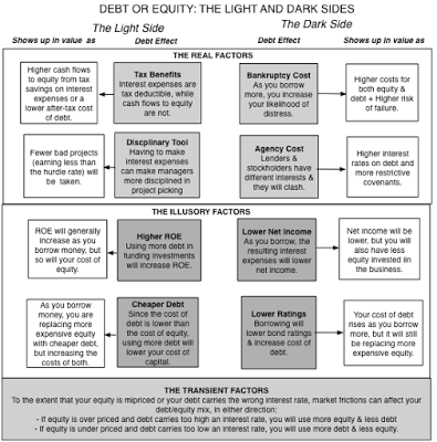 In terms of the real factors that drive the trade off, debt creates two benefits. The biggest comes from the tilt in the tax code, which allows interest expenses to be tax deductible and cash flows to equity to be not. The secondary benefit is that debt can operate as a disciplinary mechanism, with the discipline of having to make debt payments restraining managers from taking truly abysmal projects. These benefits have to be offset against two big costs, the first and biggest being the increased likelihood of distress and the second being the potential for disagreements between lenders and equity investors about the future of the firm (and how it plays out as debt covenants). All of these factors show up in the cash flows and risk assessment of a business. There are however illusory factors that can be distracting. On the benefit side, there are some who argue that debt is good because it can push up your return on equity or point to the fact that the cost of debt is lower than the cost of equity. Both statements are generally right, but the flaw in reasoning in both is that they assume that as you borrow more money, your cost of equity will remain unchanged, and it will not. In fact, in the absence of debt and distress, the positive and negative effects will offset each other, leading to no value change. On the cost side, debt detractors will note that the interest expenses associated with debt will lower net income, ignoring the fact that the lower net income is now being earned on a lower equity base. If the argument is that debt will increase default risk and the cost of debt, it is worth pointing out that even at the higher cost, debt is still cheaper than equity. Finally, there are transient factors that come from market frictions, where if your equity is mis-priced or the interest rate on your debt is set too low or high (given your default risk), you (as the company) may take advantage of the friction, using more debt if equity is under priced and debt carries too low an interest rate and less debt if equity is over priced and debt carries too high a rate. This, of course, will require CFOs of companies to embark on that most dangerous of expeditions, of judging market assessments of their value and risk. The picture below brings together all of the elements: