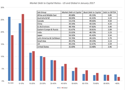A large percentage of firms, more than 25% in the US and almost 20% globally, have no debt. Regionally, on a market debt to capital ratio, Eastern Europe(with Russia) and Latin America are the most highly levered regions of the world, but in terms of debt as a multiple of EBITDA, Canadian and Chinese companies have the highest debt burden.