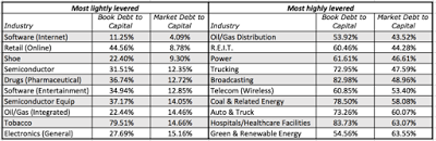 Industry DifferencesYou would expect companies in different sectors to have very different policies on financial leverage, and most of the differences have to do with where they fall on the debt trade off. In the table below, I list the most highly levered and lightly levered non-financial service sectors in the United States, in terms of market debt to capital ratios.