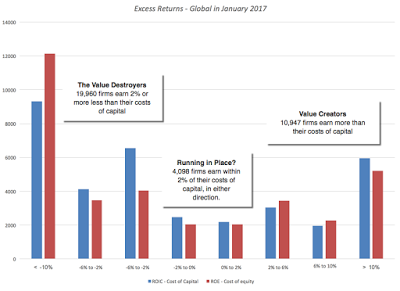 In summary, the primary threats to stocks at the start of 2017, whether you look at implied equity risk premiums or PE ratios, come from two sources. The first is that interest rates will rise quickly, without a concurrent increase in earnings, and the second is that companies will scale back the cash they return to stockholders to get back to a sustainable payout. Is there a reasonable probability that these events could occur? Of course, and if they both do, it will be a bad year for stocks. However, there is almost equal likelihood that as interest rates rise, earnings will rise even more (partly because of higher inflation/growth and partly because of cuts in corporate taxes) and that companies are able to sustain or even augment cash returned to stockholders. If this scenario unfolds, it will be a very good year for stocks. I will predict that you will be hearing from absolutists on both sides of this argument, one side preaching gloom and doom and the other predicting a market surge. I am in awe of the conviction that each side has in its market-timing judgment, but I am afraid that my market crystal ball is much too cloudy for me to make strong market predictions. So, I will do what I have always done, invest in individual stocks that I find to be priced right and accept that I have little or no control over the market.