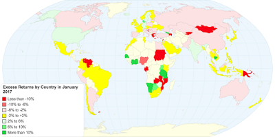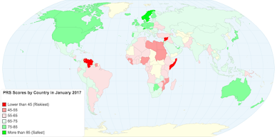 There are broader measures of country risk, taking the form of country risk scores that incorporate political, economic and legal risks, that are estimated by entities, some public (like the World Bank) and some private (like PRS and the Economist). The first is that they tend to be unstandardized, in the sense that each service that measures country risk has its own scoring mechanism, with World Bank scores going from low to high as country risk increases and PRS going from high to low. The second is that they are subjective, with variations in the factors considered and the weights attached to each. That said, there is information in looking at how the scores vary across time and across countries, with the picture below capturing PRS scores by country in January 2017. The numbers are also available in the linked spreadsheet.
