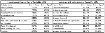 Thus, if your cost of capital in US $ is 8%, the inflation rate in $R is 6% and in US$ is 2%, your cost of capital would be 12.24%. (Using the short cut of just adding the differential inflation would yield 12%). As part of my data update, I have reported costs of capital, by industry, in US dollars, for the last two decades. In this year's update, I have added a differential inflation feature allowing you to change that cost of capital to any currency of your choice in this spreadsheet. You will need to input the inflation rate in the local currency to get the costs of capital to update and you are welcome to use either the estimates that I supply in an additional worksheet or enter your own. Remember, though, that you should stay true to whatever this estimate is when estimating growth rates and cash flows in that currency.