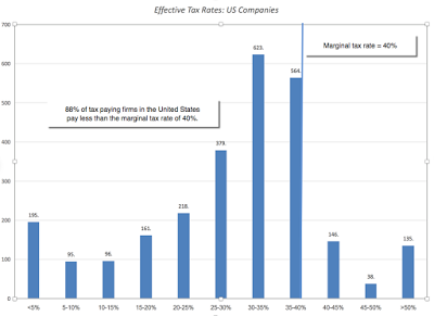 The most interesting numbers in this distribution are the average effective tax rate of 26.42% across profitable US companies, well below the marginal tax rate of 40%. and the fact that 88% of US companies have effective tax rates that are lower than the marginal. The most important reason for this difference, in my view, is foreign operations with those firms that generate revenues outside the United States paying lower taxes, simply because the tax rate on income outside the United States is much lower (and that differential tax is not due until the cash is remitted). While there are some who suggest that a simple fix for this is to force US firms to pay the entire marginal tax rate when they make their income in foreign locales immediately (rather than on repatriation), this will be a powerful incentive for US companies to move their headquarters overseas.