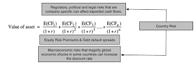 It seems to me an intuitive proposition that a company’s value and pricing can depend upon the geography of its business. Put simply, cash flows generated in riskier countries should be worth less than equivalent cash flows generated in safer ones but there are two follow up propositions worth emphasizing:Operation, not incorporation: I believe that it is where a company operates that determines its risk exposure, not just where it is incorporated. Thus, you can have US companies like Coca Cola (through its revenues) and Exxon Mobil (from its oil reserves) with substantial emerging market exposure and emerging market companies like Tata Consulting Services and Embraer with significant developed market exposure. In fact, what we face in valuation increasingly are global companies that through the accident of history happen to be incorporated in different countries.Company, Country and Global Risks: Not all country risk is created equal, especially as you are look at that risk as a diversified investor. Some country risk can be isolated to individual companies and is therefore averaged out as you diversify even across companies in that country. Still other country risk is country-specific and can be mitigated as your portfolio includes companies from across the globe. There is, however, increasingly a portion of country risk that is global, where even a global investor remains exposed to the risk and more so in some countries than others. The reason that we draw this distinction is that risks that can be diversified away will affect only the expected cash flows; that adjustment effectively takes the form of taking into account the likelihood and cash flow consequences of the risk occurring when computing the expected cash flow. The risks that are not diversifiable will affect both the expected cash flows and also the discount rates, with the mode of adjustment usually taking the form of higher risk premiums for equity and debt. That may sound like double counting but it is not, since the expected cash flows are adjusted for the likelihood of bad scenarios and their consequences and the discount rate adjustment is to demand a premium for being exposed to that risk: