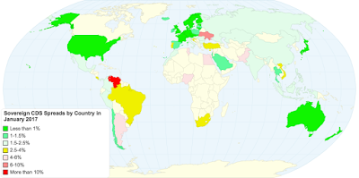 Link to live version of mapGovernment Bond Default Spreads: When a government issues bonds in a foreign currency, that are traded, the interest rate on those bonds can be compared to the risk free rate in a bond issued in the same currency to arrive at measures of default risk for the government. In much of Latin America, for instance, where countries has US-dollar denominated bonds, comparing the rates on those bonds to the US T.Bond rate (of equivalent maturity) provides a snapshot of default risk. The table below summarizes government bond default spreads as of January 1, 2017, for Latin American countries with US dollar denominated bonds:Sovereign CDS Spreads: This measure of default risk is of more recent vintage and is a market-determined number. It is, roughly speaking, a measure of how much you would have to pay, on an annual basis, to insure yourself against country default and unlike ratings can move quickly in response to political or economic developments in a country, making them both more timely and more volatile measures of country risk. In January 2017, sovereign CDS spreads were available for 64 countries and you can see them in the picture below and download them as a spreadsheet at this link.