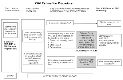 Since the volatility ratio can be both difficult to get at a country level and volatile, especially if the government bond is illiquid, I compute volatilities in an emerging market equity index and an emerging market government bond index and use the resulting ratio as a constant that I apply globally to arrive at equity risk premiums for individual countries. In January 2017, I started my estimates with a 5.69% equity risk premium for mature markets (set equal to the implied premium on January 1, 2017, for the S&P 500) and then used a combination of default spreads for countries and a ratio of 1.23 for relative equity market volatility (from the index volatilities) to arrive at equity risk premiums for individual countries.