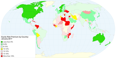 For countries that had both sovereign CDS spreads and sovereign ratings, I was able to get different measures of equity risk premium using either. For countries that had only a sovereign rating, I used the default spread based on that rating to estimate equity risk premiums (see lookup table here). For those countries that also had sovereign CDS spreads, I computed alternate measures of equity risk premiums using those spreads. Finally, for those frontier countries (mostly in the Middle East and Africa) that were neither rated nor had sovereign CDS spreads, I used their PRS scores to attach very rough measures of equity risk premiums (by looking at other rated countries with similar PRS scores). The picture below summarizes equity risk premiums by country and the link will give you the same information in a spreadsheet.