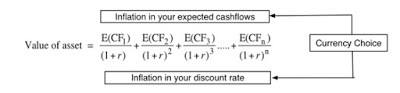 If your valuations are sensitive to your currency choice, you face a fundamental problem. You can find the same company, at the same pricing and point in time, to be both under and over valued, an indefensible conclusion. That conclusion, though, is being driven by some aspect of your valuation process that is making your company's fundamentals (risk, growth and cash flow potential) look different when you switch currencies. That, in my view, is a violation of intrinsic valuation and it requires you to make your inflation assumptions explicit and check for consistency.