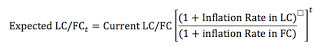 If you want to make your valuations currency invariant, and inflation is what sets currencies apart, the way to estimate expected future exchange rates is to assume purchasing power parity, where exchange rates move to capture differential inflation. Specifically, you can get from the current exchange rate of local currency (LC) for the foreign currency (FC) to an expected exchange rate in a future year (t) using the expected inflation rates in the two currencies: