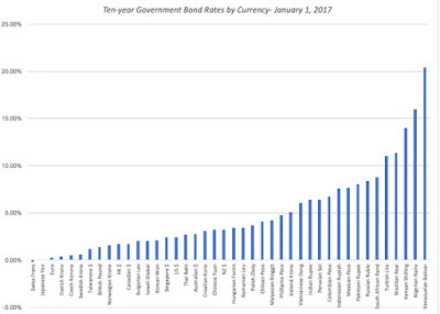 In this, the most common practice in valuation, analysts assume that the local currency government bond rate is the risk free rate in that currency. To justify this usage, they argue that governments will not default on local currency bonds, since they can always print off enough currency to pay off debt. In table 1, I graph local currency 10-year government bond rates as of January 1, 2017 for those currencies where I was able to obtain them.